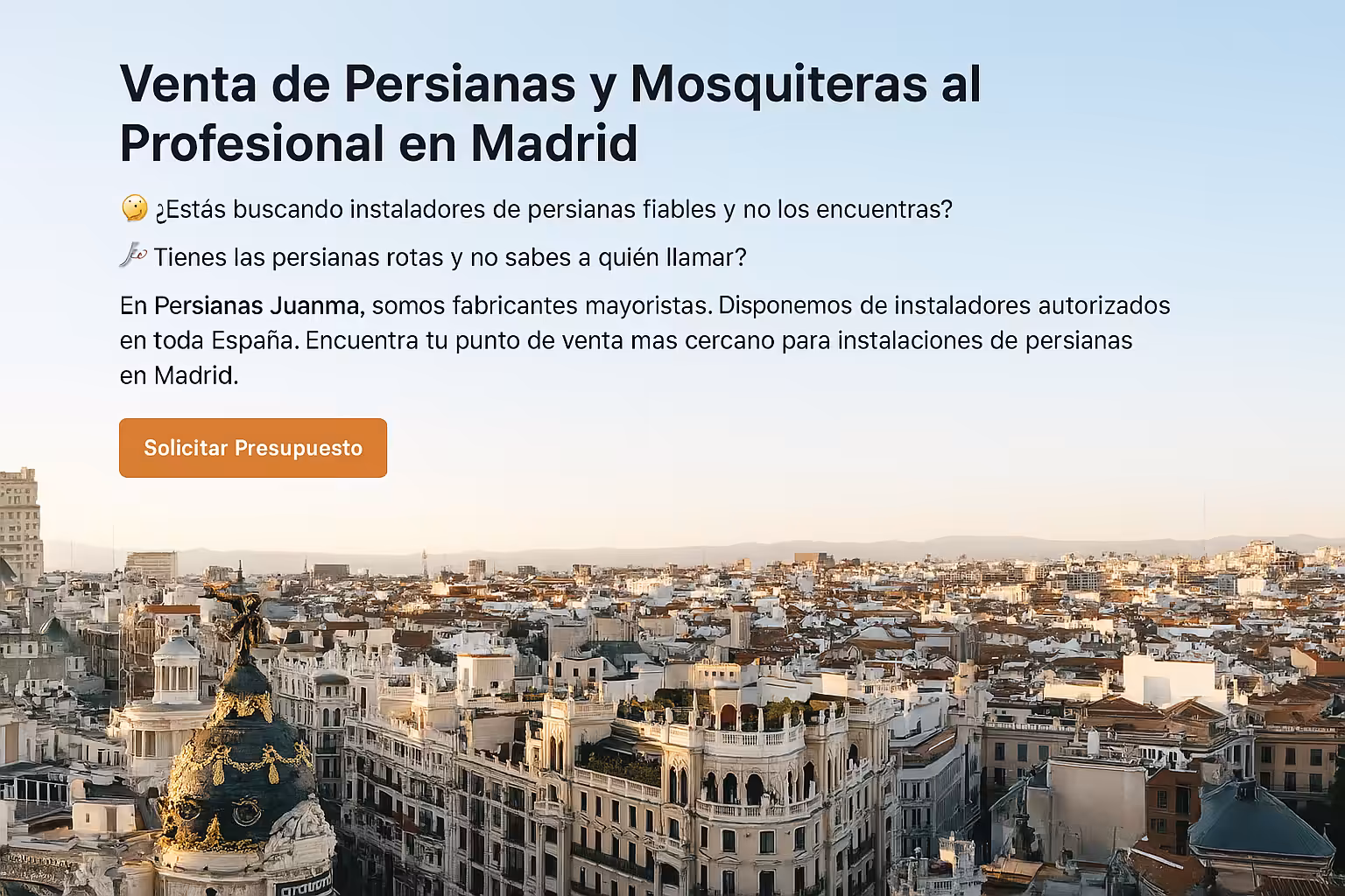 En Persianas Juanma, somos fabricantes mayoristas especializados en persianas y mosquiteras, y disponemos de una extensa red de instaladores autorizados en toda España. Te conectamos rápidamente con el punto de venta e instalación más cercano en Madrid para solucionar de inmediato tus necesidades. 🚚💨
